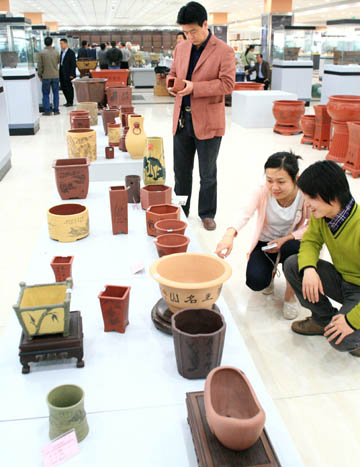4月21日,在江蘇宜興舉行的“明清紫砂花盆收藏展暨當(dāng)代名家名作展”上,參觀者欣賞獲獎(jiǎng)的紫砂花盆。