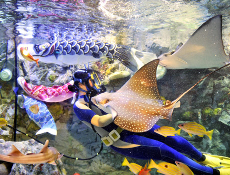 3日,在日本東京一家水族館,潛水員和魟魚(yú)嬉戲。她周?chē)鷴熘鞣N顏色的鯉魚(yú)旗,水族館用這種方式迎接兒童節(jié)。5日是日本的兒童節(jié),每逢這個(gè)時(shí)候,日本人都會(huì)在家門(mén)口升起鯉魚(yú)旗,祝愿孩子茁壯成長(zhǎng)。新華社/法新