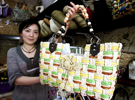 5月4日,蘇州市景德路旁一家草編工藝商店的工作人員展示一款草編女包。立夏將至,蘇州市場(chǎng)上推出的清涼又環(huán)保的草編女包深受女性顧客青睞。新華社發(fā)
