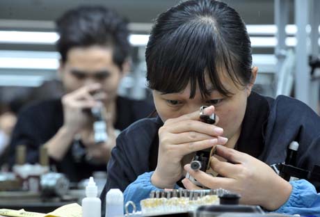 廣州市番禺區(qū)的400多家珠寶玉石企業(yè)為應(yīng)對(duì)金融危機(jī)給出口帶來(lái)的沖擊,積極開(kāi)拓國(guó)內(nèi)市場(chǎng)。2008年,番禺珠寶外銷總額13億美元,同比增長(zhǎng)6.47%,而內(nèi)銷同比增長(zhǎng)70%。圖為廣州番禺珠寶產(chǎn)業(yè)發(fā)展中心一家珠寶企業(yè)的員工在車間工作。