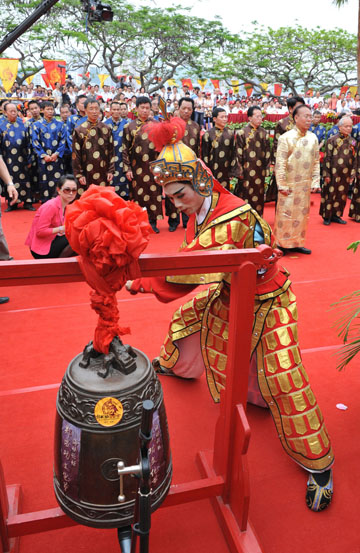 5月17日,演員在“海峽論壇·鄭成功文化節(jié)”開幕式上鳴鐘。 當(dāng)日,由福建省廈門市思明區(qū)政府、廈門市文化局聯(lián)合舉辦的“海峽論壇·鄭成功文化節(jié)”在廈門開幕,海峽兩岸數(shù)百名有關(guān)人士為鄭成功舉行隆重的頌典禮儀。 新華社記者 何俊昌 攝