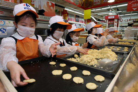 6月1日,無錫小朋友在超市里學(xué)習(xí)制作餅干。當(dāng)日,江蘇省無錫市僑誼幼兒園組織孩子們在一家超市學(xué)做糕點(diǎn),了解食品制作過程和食品衛(wèi)生安全知識,過一個(gè)不一樣的兒童節(jié)。