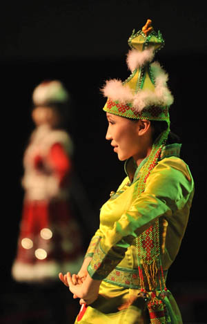 新疆維吾爾自治區(qū)的蒙古族模特在展示時尚的蒙古族服飾。