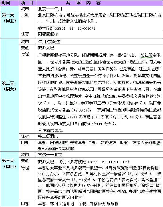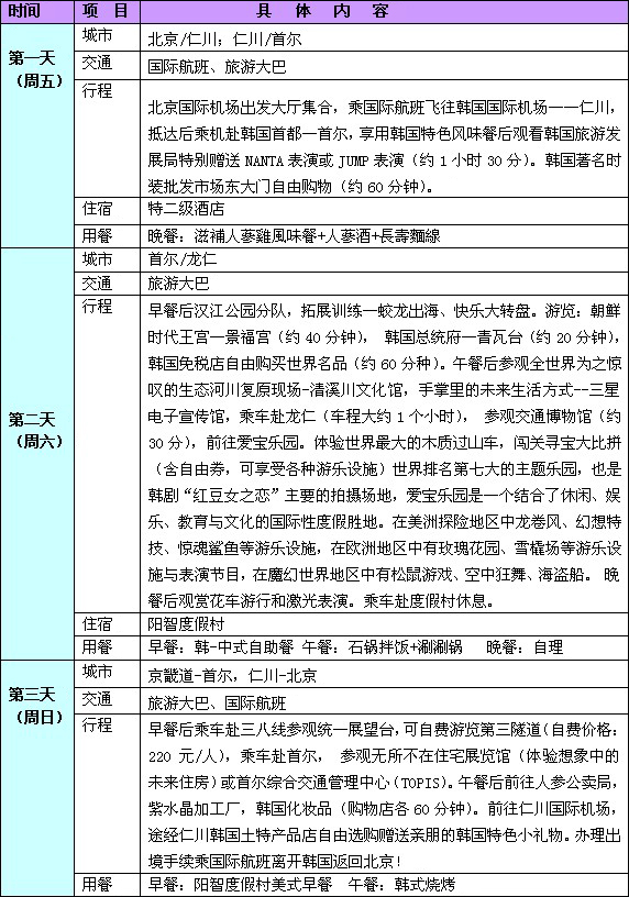 行程報(bào)價(jià):2880元/人,憑華聲在線王建五的博客優(yōu)惠券:(http://wangjianwu.blog.voc.com.cn)每人可優(yōu)惠300元,售價(jià)僅為2580元/人。 費(fèi)用包含以下內(nèi)容:韓國全程特二級酒店以上標(biāo)準(zhǔn)或韓式渡假村/房間2人1間/1日3餐/全程華語導(dǎo)游;包含國際及境外交通費(fèi)/全程機(jī)場稅/第一景點(diǎn)門票/簽證費(fèi)/旅行社責(zé)任險(xiǎn);全程活動(dòng)拓展組織費(fèi)。 不含護(hù)照費(fèi)/國內(nèi)交通費(fèi)/個(gè)人消費(fèi)/小費(fèi)(30元/人天),自費(fèi)項(xiàng)目和旅游意外傷害保險(xiǎn)。