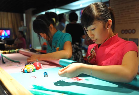 8月16日,北京劇裝廠的工作人員在現(xiàn)場展示“燕京八絕”之一的京繡。當(dāng)日,第二屆中華民族藝術(shù)珍品文化節(jié)在位于北京崇文區(qū)的中華民族藝術(shù)珍品館開幕。據(jù)介紹,為期一月有余的此次文化節(jié)包括藏傳佛教藝術(shù)珍品展、海外遺珍———海峽兩岸紅山玉文物瑰寶展、“燕京八絕”傳統(tǒng)技藝展等七個主題展以及古玉鑒定講座、藝術(shù)珍品拍賣等多項活動,將系統(tǒng)地展示反映中國古代、近現(xiàn)代和當(dāng)代民族藝術(shù)的珍品。 |