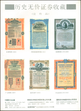 記得1994年夏季的時(shí)候,新華社中國(guó)圖片社曾經(jīng)計(jì)劃出版一套歷史無(wú)價(jià)證券收藏品,預(yù)計(jì)全套大約在25~30張之間,由珠海經(jīng)濟(jì)特區(qū)拱圖貿(mào)易公司代理;這套歷史無(wú)價(jià)證券收藏品,同時(shí)還是香港國(guó)際防偽增值科技公司的項(xiàng)目。