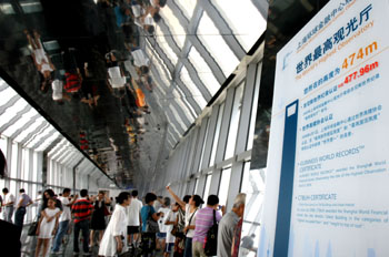 8月27日,“吉尼斯世界紀錄”正式認證上海環(huán)球金融中心100層觀光天閣為“世界最高觀光廳”(認證海拔高度為477.96米);與此同時,位于上海環(huán)球金融中心79層至93層的上海柏悅酒店也獲得“世界最高酒店”的吉尼斯世界紀錄認證。圖為游客在上海環(huán)球金融中心100層觀光天閣內(nèi)游覽。