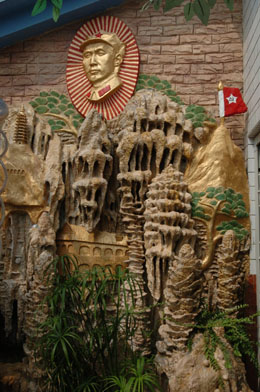 他用自己收藏的毛主席像章拼成了一幅中國(guó)地圖,并在屋頂花園內(nèi),按照地理方位和比例建造了一條紅軍長(zhǎng)征路,從瑞金到吳起,途經(jīng)的遵義、毛兒蓋等重要地點(diǎn)一應(yīng)俱全,紅軍井、古樹(shù)、碑刻、山水等形象逼真,他還特意請(qǐng)來(lái)遵義市老紅軍王道金簽名題字。