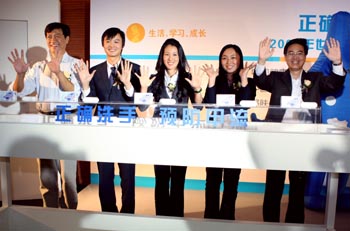 衛(wèi)生部應(yīng)急辦張國新副主任、中國健康教育中心衛(wèi)生部新聞宣傳中心陶茂萱副主任、中國紅十字會(huì)賑濟(jì)部王平部長、舒膚佳品牌總監(jiān)周濤、舒膚佳健康大使楊揚(yáng)5人共同演示正確洗手方法。本報(bào)記者