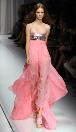 著名設(shè)計(jì)師迪安·馮菲爾斯滕貝格現(xiàn)任美國時(shí)裝設(shè)計(jì)師協(xié)會(huì)主席,她帶來了用珍珠和翡翠鑲邊的束胸上衣,以及用色豐富、充滿波西米亞風(fēng)情的長裙。整場(chǎng)時(shí)裝秀融合了吉卜賽文化、印度文化和伊斯蘭文化,宛如沙漠里的夏季。