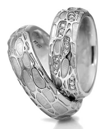 由PeterH eim設計的C roconuts鉑金婚戒(Pt950)表面紋理極富質(zhì)感,鑲嵌有專門為“她”而呈現(xiàn)的明亮琢型鉆石。在2009InhorgentaE urope國際珠寶展覽會上,該款設計榮獲了國際鉑金協(xié)會(P G I)德國分會授予的鉑金婚戒類“2009最受歡迎鉑金設計”大獎。