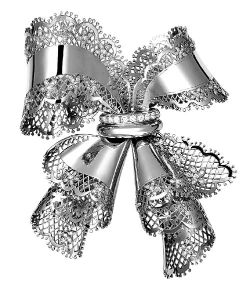蝴蝶結(jié)是高級訂制時(shí)裝的基本裝飾元素,長久以來也是法國珠寶品牌梵克雅寶優(yōu)美傳統(tǒng)的組成部分。無論簡單還是復(fù)雜,蝴蝶結(jié)都以其獨(dú)具的立體美感襯托出女性雍容的美態(tài)。布料和珠寶相互幻化難分彼此,精巧的手工甚至令L ace胸針透現(xiàn)柔麗肌膚。這枚于1945年創(chuàng)作的黃金蝴蝶結(jié),飾有黃金蕾絲花邊,綴飾的鉆石小花更顯精巧工藝。