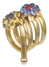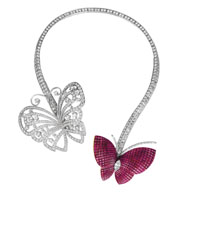 本次展覽的主題為“美之魂”(THESPIRTOFBEAUTY),展覽在東京的森美術(shù)館內(nèi)營造了一片森林深處的珠寶秘園。在那里,百年來梵克雅寶旗下的得意之作齊聚一堂,閃耀奪目卻又不相互爭艷。因為盡管時代變遷,但“美之魂”沒有改變。百年前的美仍在今天贏得了人們的贊譽,訴說著傳奇的故事。 展覽共分“自然之師”“優(yōu)雅之師”“搜奇之師”和“靈氣之師”4個主題展區(qū)。從進入展區(qū)之時,便仿佛步入了一片神秘的森林。耳邊傳來鳥兒清脆叫聲的背景音樂,蜿蜒的白色樹枝躺在一旁,樹枝上落滿了“朝露”。而每一件精致的珠寶作品就被藏在透明的形似露珠的圓形玻璃罩內(nèi)。“這個主題區(qū)的燈光最暗,想展示一種太陽還未升起時,森林深處生命活動的跡象。”梵克雅寶日本公司公關(guān)部負責人齋藤佳子告訴記者。 “自然之師”展區(qū)集中展示了體現(xiàn)大自然的珠寶作品,其中最耀眼的當屬蝴蝶圖案的首飾。雙蝶項鏈是整個展覽的第一件作品,也是齋藤最喜歡的一件。兩只不同顏色的蝴蝶各落在項鏈的兩邊,似在訴說著相戀的故事。該作品共使用了重達35克拉的鉆石。 而在不遠處,還有幾十只“蝴蝶”在翩翩起舞。在一個展示罩內(nèi),懸掛著幾十只神態(tài)各異、栩栩如生的舞蝶胸針,仔細看才發(fā)現(xiàn)蝴蝶翅膀上都鑲嵌有大自然圖案。該作品運用了日本傳統(tǒng)的漆繪工藝,將仙鶴、烏龜、花草等圖案刻畫在蝴蝶的翅膀上。真不知道,這些珍奇的彩蝶如果一齊在林中飛舞,將會是怎樣的一幅奪目景象。
