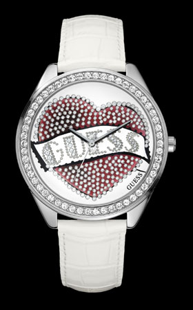 ▲銀色鑲水晶拋光表殼,白色琺瑯鑲紅水晶心形GUESSLOGO表盤,白色仿鱷魚皮表帶……所有這些元素都構(gòu)成了GUESS新款女士腕表系列TattooYou(個性文身)的必備元素。男士方面,叛逆、歐羅巴運動和周游世界成為了GUESS表款的新一季主題。