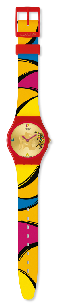 Swatch為這個(gè)專屬于中國人的特別節(jié)日奉上了一款生肖腕表——炫虎迎福。這款腕表以時(shí)尚設(shè)計(jì)與中國傳統(tǒng)風(fēng)格遙相呼應(yīng)。明黃色的腕帶與鮮紅色的帶環(huán)相配,飾以五色相間的彩色條紋。表盤中央印有一個(gè)碩大的啞光金色中國漢字“虎”,精致的浮雕工藝令它鮮活而富有層次。表盤上橫跨3點(diǎn)的位置繪制著一只縱身躍起的炫虎,亮麗的紅色指針在表盤中心不停的跳動(dòng),記錄著歡悅的分分秒秒。