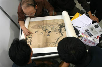 裝裱作偽也是關(guān)系到一幅造假字畫成敗之關(guān)鍵。 一幅臨摹的贗品字畫弄好后蓋上假章提上假款,就開始進入最后一道程序,就是對字畫進行“做舊”裝裱處理。在內(nèi)地某仿古字畫街上,筆者親眼目睹了裝裱字畫的全過程。 他們所使用的紙張作偽原理也很簡單,即用煙熏、吸潮、茶葉水、促霉等方法使成品表面讓人在觀看、鼻聞、手摸時都能產(chǎn)生古舊的感覺,把偽作保存在放了很多樟腦丸的樟木箱內(nèi)數(shù)日就成。 之后再把成品故意做成十分破損,有的在字畫后面還涂上一些黃泥狀物,給人的感覺就像是拆舊房時從墻上取下來的,有的上面還有很多像針尖一樣的“蟲眼”,讓人一眼看去,這幅字畫就是很久很久以前從前幾輩人那里留傳下來的“古董字畫”。如本人購得一幅齊白石的“蝦”,就是如此裝裱造假的。 這里的造假不背人。老板說,假造的程度你看著達到滿意為止,哪點兒不像,繼續(xù)加工運作,直到買方滿意為止。另外,還有大批量的瓷器、青銅器造假也是當著眾人的面明目張膽地進行。正如老板所言,“我們造假得到的利潤很薄,只要有利就賣,一幅偽作只要能從中賺個10元、8元就可以了,所以每天全國各地的文物販子都會光臨我們這仿古一條街! 字畫造假的手段還有許多。奉勸那些真正喜愛字畫的收藏投資者,不妨多到外邊走走看看,這樣既可開闊眼界,提高鑒賞的水平,又能做到防止上當受騙,從而減少每每交了“學(xué)費”后悔不已的心情。 |