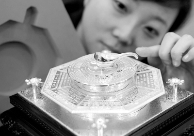2月8日,北京菜百的工作人員在展示“和合盤”。 當(dāng)日,一款名為“和合盤”的黃金工藝品在北京菜市口百貨商場正式上市銷售。該作品由古代司南、周易羅盤和八角盤等古代經(jīng)典視覺符號構(gòu)成,兼具收藏和投資價值。