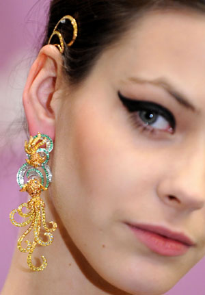 日前,香港貿(mào)易發(fā)展局在香港會議展覽中心舉行新聞發(fā)布會,公布第十一屆香港珠寶設(shè)計(jì)比賽結(jié)果。本屆香港珠寶設(shè)計(jì)比賽以“珠寶無限”為主題,分為公開組和學(xué)生組,評選出工藝技術(shù)獎、公開組(戒指)大獎、公開組(耳環(huán))大獎、公開組(胸針)大獎以及學(xué)生組的冠亞季軍等共七個(gè)獎項(xiàng),獲獎作品將于3月5日至9日舉行的第27屆香港國際珠寶展上展出。圖為模特在展示獲得公開組(耳環(huán))大獎的耳環(huán)——“韻”。 |