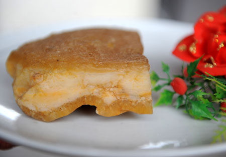 在江西省贛縣客家文化城,奇石愛好者丘延榮收藏了一組酷似菜肴的奇石,紅燒肉,大塊魚,豬心,豬舌,雞蛋,鴨蛋,鵝蛋等,這一道道由石頭組成的客家菜,加起來一共有56道,命名為“客家奇石宴”。