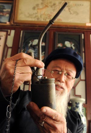 3月21日,在河北永清縣李莊子村,李贏老人正在把玩他收藏的一個水煙壺。李贏是河北省永清縣李莊子村一名普通農(nóng)民,他花費幾十年時間收藏了涉及瓷器、陶器、銅器、木器等幾十類共4000多件藏品,并在自家庭院中建起了民俗博物館,吸引了鄉(xiāng)鄰和眾多外地游客前來參觀。