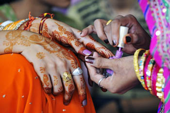 印度女性結(jié)婚前,要隆重舉行多種儀式。其中,紋圖儀式就是頗為重要的一環(huán),主要由新娘家族成員或朋友參加。在印度,不同地區(qū)有著不同的新娘紋圖儀式。 薩羅杰教授介紹說,新娘紋圖儀式一般選擇婚禮前夕或幾天前在宴會廳或其他地方舉行。紋圖儀式開始后,設(shè)計師或新娘的親戚和家庭成員就會開始在新娘手上紋圖。在印度一些地方,如果新娘的第一個基本圖案由母親親手繪制,則意味著吉祥。新娘紋圖期間,參加儀式的婦女們會唱著傳統(tǒng)歌曲,跳著傳統(tǒng)舞蹈,如同過節(jié)一般慶賀。 紋圖是件頗為“藝術(shù)”的事。上乘的紋圖需要幾個小時,甚至一、兩天時間。為了讓圖案保持長久,一般要在圖案上涂抹糖和檸檬汁。圖案紋好后,還要抹上丁香油,自然晾干數(shù)個小時,才能保持鮮亮的顏色。這樣的紋圖多能保持幾周,甚至幾個月的時間。印度傳統(tǒng)文化思想認為,新娘的紋圖保留時間越長,未來的日子越吉祥。當(dāng)然,這樣的紋圖要價很高,需要1萬盧比(1美元約合46盧比),甚至更多。 紋圖一般紋在手上,也有紋在腳上的。此外,人體其他容易展示美的部位也在選擇之列,包括背部和上腹部等。在手上紋圖時,可選擇手掌、手背、手指和手腕等部位。足部紋圖則包括腳背以及腳腕等。新娘紋圖一般選擇大家喜歡的植物,包括一些樹的樹葉和花等。 紋圖對顏色的選用也很有講究,一般運用黑色或棕黃色。薩羅杰說,在印度西北部的拉賈斯坦邦,許多新娘喜歡黑色;在孟買,許多新娘選擇棕黃色。不僅如此,印度新娘對顏色的深淺也有特殊的要求。傳統(tǒng)思想認為,紋圖的顏色越深,意味著新郎對新娘的愛將越深。 在一些地區(qū)“有心計”的新娘會在紋圖上暗設(shè)種種“機關(guān)”,以考察新婚的夫君。比如,有的新娘會把新郎的名字暗藏在紋圖里。新娘看到新郎后,要求新郎在一定時間內(nèi)從紋圖中迅速找出自己的名字,以考驗新郎是否有好的眼力和靈活頭腦。然而,這是很艱難的“識別”任務(wù)。圖案樹葉密密麻麻,字母也很小。如果考試合格,新郎將給新娘留下一個很好的印象。如果新郎遲遲找不到自己的名字,一些喜歡捉弄人的新娘就會趁機把新郎數(shù)落一番,要求新郎在屋內(nèi)罰跑幾圈,給他一個“下馬威”。