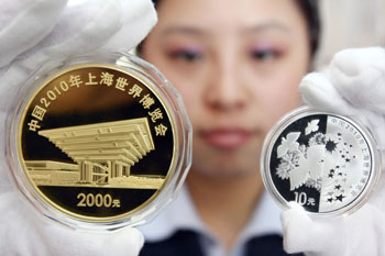 中國人民銀行分別于2009年6月10日和2010年4月22日發(fā)行中國2010年上海世界博覽會(huì)金銀紀(jì)念幣第1組一套和第2組一套。第一組紀(jì)念幣共3枚,其中1/3盎司金幣1枚,1盎司銀幣2枚;第二組紀(jì)念幣共4枚,其中金幣2枚,1盎司銀幣2枚,除了1/3盎司金幣1枚外,另外1枚金幣為5盎司,均為中華人民共和國法定貨幣。 |