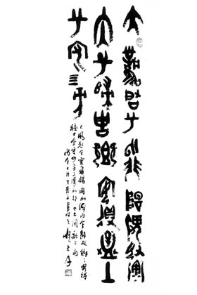 在上海世博會上,他的甲骨文鐫中國紅鈺瓷巨型寶瓶和絲繡甲骨文藝術(shù)長卷向來自世界各地的游客展示中國古老文字的魅力;在海外,他因?qū)懸饧坠俏亩蛔u為“龍”先生,其作品被海內(nèi)外許多名家學(xué)者企業(yè)家收藏。他就是著名的甲骨文書法藝術(shù)大師——“怪夫子”宋大海。 宋大海的寫意“龍”字甲骨文在海外華人圈中有口皆碑,凡是看到他書寫的“龍”字的人,無不為之振奮。在這位“怪夫子”的筆下,龍在騰云駕霧,龍在長空飛舞,龍之精神、龍之豪邁、龍之雄威、龍之氣勢無不躍然其間,龍駕雄風(fēng)乘萬里之志,龍有躍長空攀凌云之功。有人評價說:“‘怪夫子’筆勢千變?nèi)f化,筆力遒勁蒼郁,有時瀟灑飄逸,有時行若云浮,有時力拔千鈞、粗獷委婉,搭配相宜,起筆與落筆結(jié)構(gòu)得體,有若行云流水,有若虹開雨霽,他把龍的精神、氣魄、風(fēng)骨、形態(tài)書寫得巧妙無比! 能將甲骨文藝術(shù)書到如此境界,“怪夫子”的甲骨文書法文化底蘊可謂非常豐厚,而這種積淀又源于他60余年的專心研究。不論在何種艱苦的條件下,“怪夫子”都從未間斷過對甲骨文的研究。 “讀萬卷書,行萬里路”。幾十年來,“怪夫子”一直在故紙堆中探尋甲骨文的真諦,他的足跡不僅遍布中華大地,甚至還涉及非洲的一些民族部落。他曾數(shù)十次赴甲骨文的誕生地河南安陽殷墟,他還親自到非洲體驗造字環(huán)境,試圖與幾千年前的古人類對話、同悠久的中華民族歷史對話、同非洲原始的部落民族對話。60載的苦心研習(xí),讓如今的“怪夫子”對甲骨分期斷代、文字釋考、卜法文例等關(guān)鍵學(xué)術(shù)課題有了深入認識。 作為目前已知的我國古代文字中時代最早、體系較為完整的文字,甲骨文一直以來都帶著一種神秘色彩,不過宋大海與甲骨文的緣分卻很早就開始了。在談到自己的經(jīng)歷時,他曾表示:“自幼,我就很喜歡中國古文化,特別是古文字。在我幼小心靈里就扎下了這么一個深深的根。開始只是興趣,當(dāng)然,興趣是成功的起點。我七歲就開始習(xí)古了,先是跟著祖父、舅舅學(xué)古文字,跟著他們跑,他們當(dāng)時是鄉(xiāng)間的秀才。久而久之,學(xué)習(xí)研究古文字的興趣就實在割舍不下了。在當(dāng)時,我幼小心靈里總覺得這些都是祖宗留下來的最寶貴的東西,不能把它扔進海里漂沒了。祖宗創(chuàng)造出的東西,必定是有他的道理。長輩們告訴我,這些東西是中國獨有的,哪個國家都沒有。由此,我就更加酷愛對古文字的研究了。” 在研習(xí)甲骨文字知識時,宋大海還得到了當(dāng)時的中國社會科學(xué)院院長、著名甲骨文專家郭沫若的指導(dǎo)。 大二那年,宋大海給郭沫若寫了一封信,希望能得指教。在信中,宋大海還寫了十幾個甲骨文。不久后,他收到了郭沫若的回信:“鍥而不舍,必有大進”。自此后,宋大海便常常把自己的習(xí)作寄給郭沫若,請他指導(dǎo)。有時他還會到郭沫若的辦公室,親耳聆聽郭老的教誨。郭沫若除了教給他古文字學(xué)之外,還教了他一個“變”字。郭沫若曾對他說,世上任何事物都在變化發(fā)展,研究甲骨文也一樣,不能只停留在發(fā)現(xiàn)與研究上。這種求“變”的思想一直影響著宋大海的古文字研究,是他進行寫意甲骨文創(chuàng)作的原始動力。 |