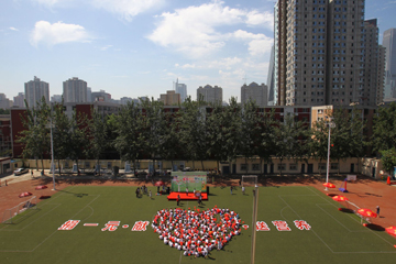 7月2日,作為前期預(yù)熱的北京愛心傳遞活動拉開帷幕。當(dāng)日,北京呼家樓中心小學(xué)五年級的孩子們像過節(jié)一樣高興,他們的好朋友——“面包人”小愛來到他們身旁,把千余個精致可愛的面包造型的零錢包送到了孩子手中。而在小學(xué)操場中央,巨型大字拼成的“捐一元·獻(xiàn)愛心·送營養(yǎng)”活動主題特別引人注目,特別是“愛心”兩個字,由小學(xué)生們用一千個紅色愛心氣球組合而成;顒娱_始,氣球帶著孩子們的愛心、希望和祝福,飛上天空。