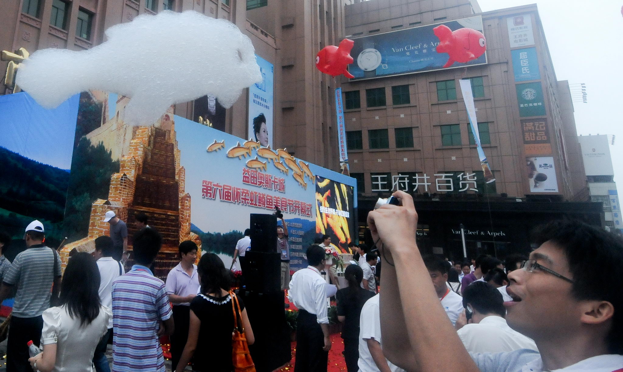 2010年7月13日,在北京王府井大街舉辦的懷柔區(qū)第六屆虹鱒魚(yú)美食節(jié)開(kāi)幕式上,一名觀眾在給一個(gè)“氣泡魚(yú)”拍照。為給儀式助興,工作人員在現(xiàn)場(chǎng)用機(jī)器將氣泡制成魚(yú)的形狀,慢慢在空中升起,吸引了不少人觀看。