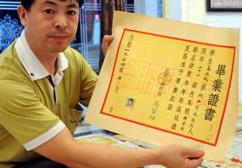 遼寧省沈陽市民間收藏家詹洪閣近日展出了十多年來收藏的各類畢業(yè)證多達千件,其中最早的可追溯到清末宣統(tǒng)二年(1910年)。這些畢業(yè)證大小不一、形式各異,叫法也不盡相同,卻是中國百年教育史的縮影。 這些畢業(yè)證名稱并不統(tǒng)一。有的名為“卒業(yè)證”,有的名為“休業(yè)證”,有的叫做“修了證”。據(jù)詹洪閣統(tǒng)計,名稱多達10余種。 年代最為久遠的是一張清末師范學(xué)堂頒發(fā)的“修業(yè)文憑”,距今整整100年。這張文憑不僅詳細記載了學(xué)生姓名、籍貫和12門功課的成績,而且學(xué)生祖上三輩“曾祖、祖父、父親”姓名都記錄在冊。 每張畢業(yè)證都有著時代的烙印。民國時期的畢業(yè)證大都印有“青天白日滿地紅”旗幟,偽滿洲國時期東北一些學(xué)校所發(fā)畢業(yè)證還印有龍紋;新中國成立后,畢業(yè)證上印上了紅旗、國旗或是毛澤東像,有的則印著“為人民服務(wù)“救死扶傷,實行革命的人道主義”等字樣。 由于畢業(yè)證上大都留有校長的親筆簽名,因此這些證書也成為老教育家執(zhí)教經(jīng)歷的見證。北京大學(xué)1954年頒發(fā)給學(xué)生高振斌的畢業(yè)證上,校長留名是著名人口學(xué)家馬寅初;民國期間國立政治大學(xué)頒發(fā)的一張畢業(yè)證,學(xué)者顧毓琇的名字寫在證書上;華北大學(xué)的一張畢業(yè)證上,校長是吳玉章,副校長是成仿吾和范文瀾。 在詹洪閣收藏的畢業(yè)證中,學(xué)歷高可達大學(xué)、碩士,低可為學(xué)前甚至掃盲。上海市新成區(qū)中心小學(xué)發(fā)給7歲的馮阿鳳的就是一張“保育證書”,上面寫著“在小學(xué)附設(shè)幼兒園保育期滿,特發(fā)此證”。還有一張是1955年發(fā)給一名30歲婦女的“識字證書”,恰是新中國成立后各地掀起掃盲識字活動的真實記錄。 |