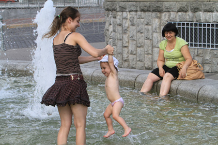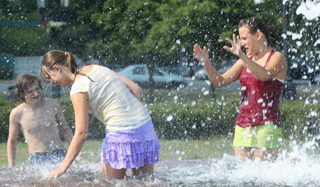▲6月下旬以來,莫斯科地區(qū)天氣一直干燥、炎熱,氣溫持續(xù)接近和超過30攝氏度,而莫斯科7月白天正常氣溫應(yīng)該在23攝氏度左右。氣象專家表示,莫斯科今夏或?qū)⒚媾R130年來最熱的夏天。圖為兩名女孩在俄羅斯首都莫斯科勝利廣場的噴泉中解暑。記者 魯金博/莫斯科報道