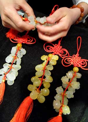 圖為商家在龍陵縣黃龍玉交易市場(chǎng)編制玉器掛件。新華社記者 秦晴/攝 |
