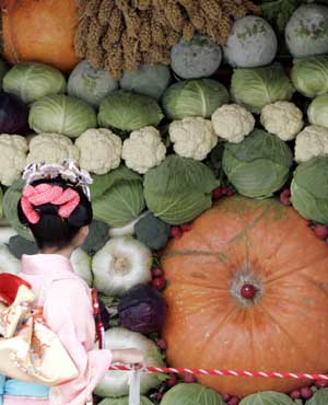 11月23日,一名女孩觀看擺放在日本東京明治神宮慶祝豐收的蔬菜祭品。