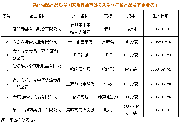國(guó)家質(zhì)檢總局日前組織對(duì)熟肉制品產(chǎn)品質(zhì)量進(jìn)行了國(guó)家監(jiān)督抽查。共抽查了北京、天津、河北、山西、遼寧、黑龍江、山東、上海、江蘇、浙江、安徽、福建、江西、河南、湖北、湖南、廣東等17個(gè)省、直轄市103家企業(yè)生產(chǎn)的125種產(chǎn)品,產(chǎn)品抽樣合格率為80%。