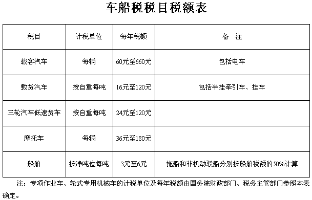 第一條 在中華人民共和國境內(nèi),車輛、船舶(以下簡稱車船)的所有人或者管理人為車船稅的納稅人,應(yīng)當(dāng)依照本條例的規(guī)定繳納車船稅。 本條例所稱車船,是指依法應(yīng)當(dāng)在車船管理部門登記的車船。 第二條 車船的適用稅額,依照本條例所附的《車船稅稅目稅額表》執(zhí)行。 國務(wù)院財政部門、稅務(wù)主管部門可以根據(jù)實際情況,在《車船稅稅目稅額表》規(guī)定的稅目范圍和稅額幅度內(nèi),劃分子稅目,并明確車輛的子稅目稅額幅度和船舶的具體適用稅額。車輛的具體適用稅額由省、自治區(qū)、直轄市人民政府在規(guī)定的子稅目稅額幅度內(nèi)確定。 第三條 下列車船免征車船稅: 。ㄒ唬┓菣C動車船(不包括非機動駁船); 。ǘ┩侠瓩C; 。ㄈ┎稉啤B(yǎng)殖漁船; (四)軍隊、武警專用的車船; 。ㄎ澹┚密嚧; 。┌凑沼嘘P(guān)規(guī)定已經(jīng)繳納船舶噸稅的船舶; (七)依照我國有關(guān)法律和我國締結(jié)或者參加的國際條約的規(guī)定應(yīng)當(dāng)予以免稅的外國駐華使館、領(lǐng)事館和國際組織駐華機構(gòu)及其有關(guān)人員的車船。 第四條 省、自治區(qū)、直轄市人民政府可以根據(jù)當(dāng)?shù)貙嶋H情況,對城市、農(nóng)村公共交通車船給予定期減稅、免稅。 第五條 車船稅由地方稅務(wù)機關(guān)負(fù)責(zé)征收。 第六條 車船稅的納稅地點,由省、自治區(qū)、直轄市人民政府根據(jù)當(dāng)?shù)貙嶋H情況確定。 跨省、自治區(qū)、直轄市使用的車船,納稅地點為車船的登記地。 第七條 車船稅的納稅義務(wù)發(fā)生時間,為車船管理部門核發(fā)的車船登記證書或者行駛證書所記載日期的當(dāng)月。 第八條 車船稅按年申報繳納。具體申報納稅期限由省、自治區(qū)、直轄市人民政府確定。 第九條 車船的所有人或者管理人未繳納車船稅的,使用人應(yīng)當(dāng)代為繳納車船稅。 第十條 從事機動車交通事故責(zé)任強制保險業(yè)務(wù)的保險機構(gòu)為機動車車船稅的扣繳義務(wù)人,應(yīng)當(dāng)依法代收代繳車船稅。 稅務(wù)機關(guān)付給扣繳義務(wù)人代收代繳手續(xù)費的標(biāo)準(zhǔn)由國務(wù)院財政部門、稅務(wù)主管部門制定。 第十一條 機動車車船稅的扣繳義務(wù)人依法代收代繳車船稅時,納稅人不得拒絕。 第十二條 各級車船管理部門應(yīng)當(dāng)在提供車船管理信息等方面,協(xié)助地方稅務(wù)機關(guān)加強對車船稅的征收管理。 第十三條 車船稅的征收管理,依照《中華人民共和國稅收征收管理法》及本條例的規(guī)定執(zhí)行。 第十四條 本條例自2007年1月1日起施行。1951年9月13日原政務(wù)院發(fā)布的《車船使用牌照稅暫行條例》和1986年9月15日國務(wù)院發(fā)布的《中華人民共和國車船使用稅暫行條例》同時廢止。