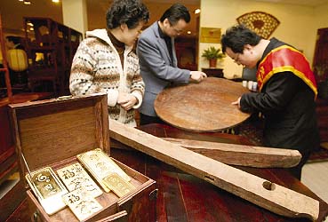 22日,北京紅木企業(yè)元亨利在紅木大觀樓擺出整盒的金條,征集散舊海南黃花梨木家什,只要通過專家鑒定是海南黃花梨木,哪怕是搟面杖、舊鍋蓋、瘸腿凳子都可換金子。1公斤黃花梨木最高能換40克黃金,價(jià)值約6800元。 工作人員介紹,按木料橫截面面積的大小,把木料分為3個(gè)等級(jí),最高等級(jí)的木料,1公斤約能換40克黃金,按照每克黃金170元計(jì)算,相當(dāng)于6800元。 元亨利總經(jīng)理?xiàng)畈ń榻B,自去年以來,紅木原料告急,價(jià)格翻番,每噸大料收購(gòu)價(jià)高達(dá)上千萬元。公司數(shù)次去海南淘料都空手而歸,目前只能試試看在北京能不能收一些零散的黃花梨木料,如果收不上來,今后主產(chǎn)黃花梨家具的元亨利將面臨無米下鍋的境地。不過他提醒說:“不是啥木頭都能換,我只要海南黃花梨!