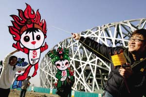 昨天(1日),工作人員在“鳥巢”(國家體育場)放飛福娃造型的大風(fēng)箏,為即將在正月初二和初三上演的奇幻童話劇《福娃》“造勢”。當天,《福娃》的近百張門票贈給“鳥巢”施工工人的子女,讓他們也能感受到奧運文化。