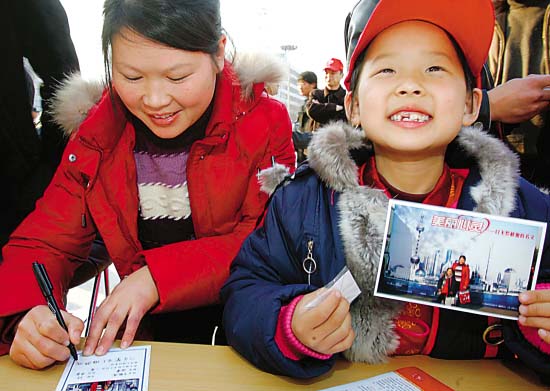昨天(11日),許多即將踏上火車回家的民工兄弟姐妹走上采血車,參加了“美麗心靈——以無償獻(xiàn)血的名義”真情互動活動。市獻(xiàn)血辦請人為他們拍照并當(dāng)場打印出來。圖中這名在上海打拼了多年的江蘇籍于女士獻(xiàn)完血后,在和女兒的合影照上寫下一句感言——“希望上海更美好”。