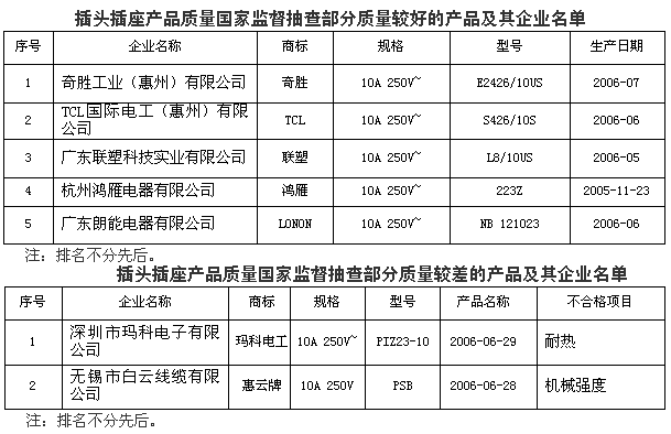 為保護消費者的合法權(quán)益,促進插頭插座行業(yè)的健康發(fā)展,國家質(zhì)檢總局對插頭插座產(chǎn)品質(zhì)量進行了國家監(jiān)督抽查。共抽查了廣東、浙江、江蘇、四川、福建、上海等6個省、市46家企業(yè)生產(chǎn)的46種產(chǎn)品,產(chǎn)品抽樣合格率為80.4%。