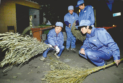 4月16日,師傅教給新上崗的耿佳明(前右)的第一課是“扎掃帚”。當(dāng)日凌晨,上海市盧灣區(qū)市容管理局新錄用的26名大中專生和技校生清道工正式上崗。這批新錄用的員工中有6名是大專生。