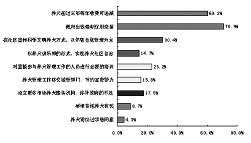 綜上所述,居民不愿意給寵物犬登記,相當(dāng)一部分原因是出于對(duì)目前管理制度有些看法。調(diào)查發(fā)現(xiàn),居民贊同的寵物犬管理辦法中,免費(fèi)強(qiáng)制注射疫苗、養(yǎng)犬超過(guò)3年且每年收費(fèi)遞減,是提及率最高的兩個(gè),分別為70.9%和60.2%。這再一次強(qiáng)調(diào)了居民“降低收費(fèi)、獲得服務(wù)”的愿望。 值得注意的是,居民對(duì)養(yǎng)犬自治(鄰居自覺(jué)管理、養(yǎng)犬俱樂(lè)部)、政府管理優(yōu)化(工作人員培訓(xùn)、管理工作移交城管)都表現(xiàn)出了較大的熱情,同時(shí)他們還希望通過(guò)市場(chǎng)機(jī)制獲得更好的養(yǎng)犬服務(wù)。 寵物犬管理是城市管理工作中的一個(gè)難點(diǎn),各個(gè)城市和國(guó)家均要根據(jù)自己的情況出臺(tái)各有特色的管理辦法。在狗身上植入“電子身份證”是目前寵物犬管理中的一項(xiàng)先進(jìn)管理技術(shù),但不論技術(shù)多先進(jìn),最首要的事還是促使居民能夠主動(dòng)為寵物上戶口,只有將寵物犬納入規(guī)范管理軌道,其他相應(yīng)的管理措施才能成行。因此,如何提高養(yǎng)犬居民的注冊(cè)意識(shí),才是各城市制定和調(diào)整養(yǎng)犬政策時(shí)應(yīng)當(dāng)首先考慮的。 寵物犬上戶口后期望應(yīng)享的權(quán)益和服務(wù)