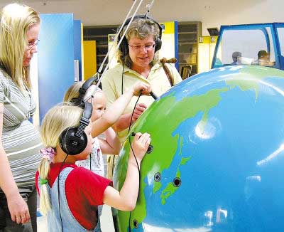 5月27日,在芬蘭首都赫爾辛基市附近的赫尤里卡科學(xué)中心主展廳的地球儀旁,芬蘭兒童頭帶耳機(jī),將耳機(jī)插頭插在地球儀不同的地區(qū),可以聽到世界各地60種語言的問候。赫尤里卡科學(xué)中心是一個(gè)深受芬蘭兒童歡迎的科技館。它通過其設(shè)計(jì)新穎、富有哲理的展品對兒童進(jìn)行深入淺出、寓教于樂的科普教育,激發(fā)他們對科學(xué)的興趣。