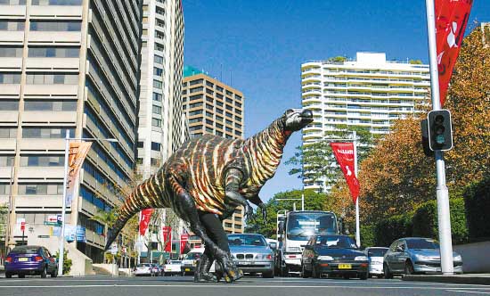 5月31日,在澳大利亞悉尼,“恐龍模特”在鬧市區(qū)穿行。當(dāng)天,一名工作人員身著3米長(zhǎng)的造型服裝,裝扮成橡樹(shù)龍走上街頭,為澳大利亞博物館新推出的戲劇節(jié)目《岡瓦納》宣傳造勢(shì)。橡樹(shù)龍是一種生活在侏羅紀(jì)晚期的食草類(lèi)恐龍。