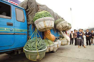 6月10日拍攝的被查處的農(nóng)用三輪車。當(dāng)日,一輛運送蔬菜的農(nóng)用三輪車在通過安徽蕪湖長江大橋時,被交警查扣。該車狹小的車廂內(nèi)擠了18人,車外掛滿裝有蔬菜的大筐。