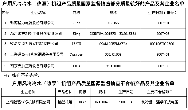 為維護廣大消費者的合法權(quán)益,促進行業(yè)健康發(fā)展,國家質(zhì)檢總局組織對戶用風(fēng)冷冷水(熱泵)機組產(chǎn)品質(zhì)量進行了國家監(jiān)督抽查。共抽查了北京、上海、江蘇、浙江、安徽、江西、山東、廣東、四川等9個省、直轄市28家企業(yè)生產(chǎn)的28種產(chǎn)品(不涉及出口),產(chǎn)品抽樣合格率為96.4%。 此次抽查依據(jù)GB4706.1-1998《家用和類似用途電器的安全