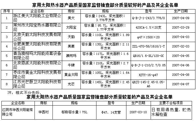 家用太陽熱水器是由太陽集熱器、貯熱水箱、管道及控制器等組成的節(jié)能產(chǎn)品,產(chǎn)品類型主要分為真空管型、平板型和悶曬型。據(jù)統(tǒng)計,2006年全國已有家用太陽熱水器生產(chǎn)企業(yè)五千多家,總產(chǎn)量達到2000萬平方米。 為維護消費者的合法權益,促進家用太陽熱水器行業(yè)健康發(fā)展,國家質(zhì)檢總局組織對家用太陽熱水器產(chǎn)品質(zhì)量進行了國家監(jiān)督抽查。共抽查了北京、河北、江蘇、浙江、安徽、山東、湖北、廣東等8個省、直轄市40家企業(yè)生產(chǎn)的40種產(chǎn)品(不涉及出口),產(chǎn)品抽樣合格率為82.5%。 此次抽查依據(jù)強制性國家標準GB4706.1-1998《家用和類似用途電器的安全第一部分
