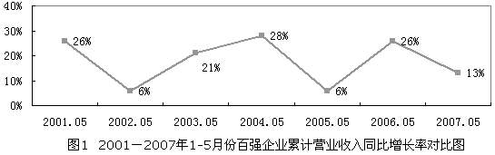 1-5月份,百?gòu)?qiáng)企業(yè)累計(jì)完成營(yíng)業(yè)收入4473.0億元,同比增長(zhǎng)13%(見圖1)。