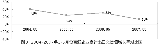 1-5月份,百?gòu)?qiáng)企業(yè)累計(jì)完成出口交貨值1214.3億元,同比增長(zhǎng)13%,增速有所放緩(見圖3)。