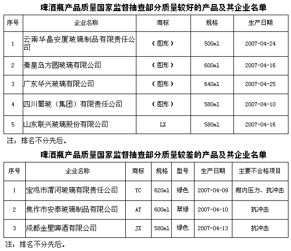 為維護(hù)廣大消費(fèi)者的合法權(quán)益,促進(jìn)啤酒瓶行業(yè)健康發(fā)展,國(guó)家質(zhì)檢總局組織對(duì)啤酒瓶產(chǎn)品質(zhì)量進(jìn)行了國(guó)家監(jiān)督抽查。共抽查了河北、山西、吉林、黑龍江、上海、江蘇、浙江、安徽、福建、山東、河南、湖北、湖南、廣東、四川、重慶、云南、陜西、甘肅、寧夏、新疆等21個(gè)省、自治區(qū)、直轄市65家企業(yè)生產(chǎn)的65種產(chǎn)品(不涉及出口),產(chǎn)品抽樣合格率為86.2%。 此次抽查依據(jù)GB4544-1996《啤酒瓶》等國(guó)家標(biāo)準(zhǔn)進(jìn)行檢驗(yàn),主要包括理化指標(biāo)和標(biāo)志指標(biāo)。涉及的主要理化指標(biāo)為:內(nèi)應(yīng)力、抗沖擊、耐內(nèi)壓力和垂直軸偏差。標(biāo)志指標(biāo)主要是為防止不耐壓的非啤酒專用瓶用來灌裝啤酒,國(guó)家標(biāo)準(zhǔn)規(guī)定在瓶底以上20mm范圍打有啤酒瓶專用標(biāo)記“B”和生產(chǎn)企業(yè)的標(biāo)記,生產(chǎn)的年、季。經(jīng)檢驗(yàn),標(biāo)志指標(biāo)項(xiàng)目全部合格,部分產(chǎn)品理化指標(biāo)中的抗沖擊和耐內(nèi)壓力不合格。 抽查結(jié)果表明,一是連續(xù)的國(guó)家監(jiān)督抽查促進(jìn)了企業(yè)質(zhì)量意識(shí)的提高,加強(qiáng)了質(zhì)量管理,使啤酒瓶產(chǎn)品質(zhì)量水平比上次抽樣合格率提高了13.6個(gè)百分點(diǎn);二是市場(chǎng)占有率較高的大中型企業(yè)產(chǎn)品質(zhì)量較好,具有先進(jìn)的生產(chǎn)工藝和嚴(yán)格的質(zhì)量管理;三是部分小型生產(chǎn)企業(yè)的產(chǎn)品質(zhì)量問題較多。 抽查中發(fā)現(xiàn)的主要質(zhì)量問題: 1、部分啤酒瓶抗沖擊力能力達(dá)不到國(guó)家標(biāo)準(zhǔn)規(guī)定的要求,抗沖擊力能力差的啤酒瓶在罐裝啤酒后,受到某種外力作用時(shí),可能會(huì)發(fā)生啤酒瓶爆炸。 2、部分啤酒瓶耐內(nèi)壓力達(dá)不到國(guó)家標(biāo)準(zhǔn)規(guī)定的要求。耐內(nèi)壓力差的啤酒瓶在盛裝啤酒后,在生產(chǎn)、運(yùn)輸和使用過程中,會(huì)因輕微碰撞而引起爆炸,也有可能發(fā)生自爆。
