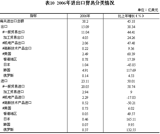 對外貿(mào)易快速增長。全年全省外貿(mào)進出口總值為38.20億美元,比上年增長45.18%,其中:出口總值為15.09億美元,增長38.34%;進口總值為23.11億美元,增長50.01%。一般貿(mào)易出口11.04億美元,增長44.41%;加工貿(mào)易出口4.05億美元,增長24.26%。機電產(chǎn)品出口2.06億美元,增長47.48%。高新技術(shù)產(chǎn)品出口0.22億美元,增長9.36%。
